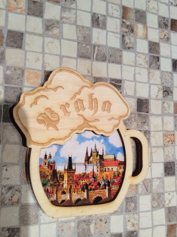 Магнит Прага деревянный фирменный, на обратной стороне указан сайт производителя. Пакетик молока для понимания размера. Экв.200