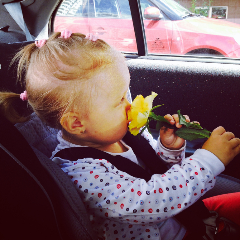На улице было ветрено, но все же сходили прогулялись и конечно же - какая истинная девушка с цветочком)) Сходили на почту еще за одним подарочком.