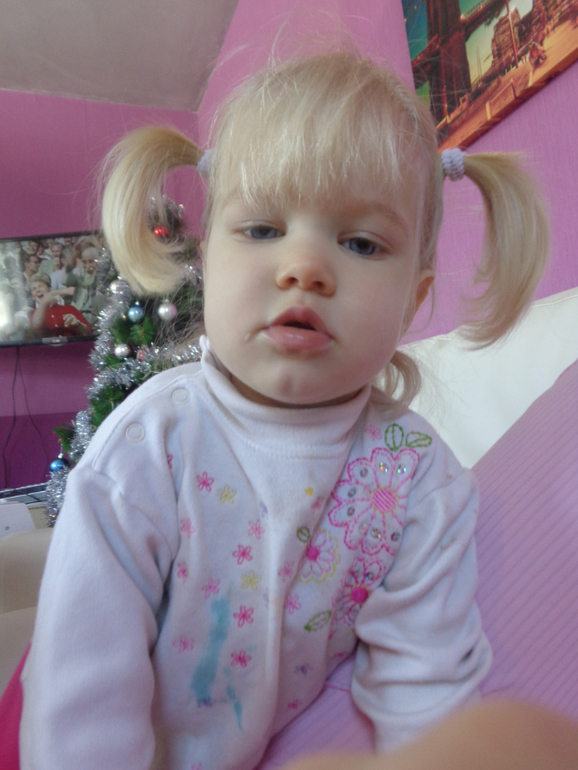 Очень нежная при настроении - с утра целует меня в плечо и бока. В течении дня часто целует и обнимает. Говорит, что я красивая и хорошая, когда её наругаю по делу. Глаза небесно-голубые и пока явно меняться не собираются, а волосы темнеют.