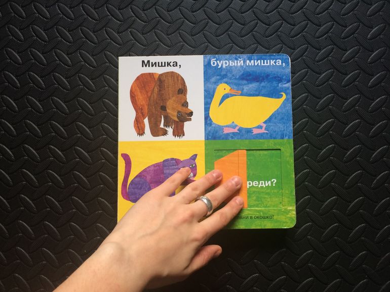Эта книжка не из дешевых, поэтому в свободном доступе я ее не оставляю - оторвать открывающиеся элементы ребенок может запросто.