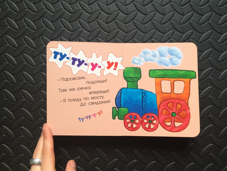 "Звуки" - книжка с простыми стихами о том, кто как говорит и звучит. Стихи въедаются в память, и, увидев игрушечный паровозик, я автоматически "завожу в голове пластинку": паровозик, подожди, там же речка впереди...