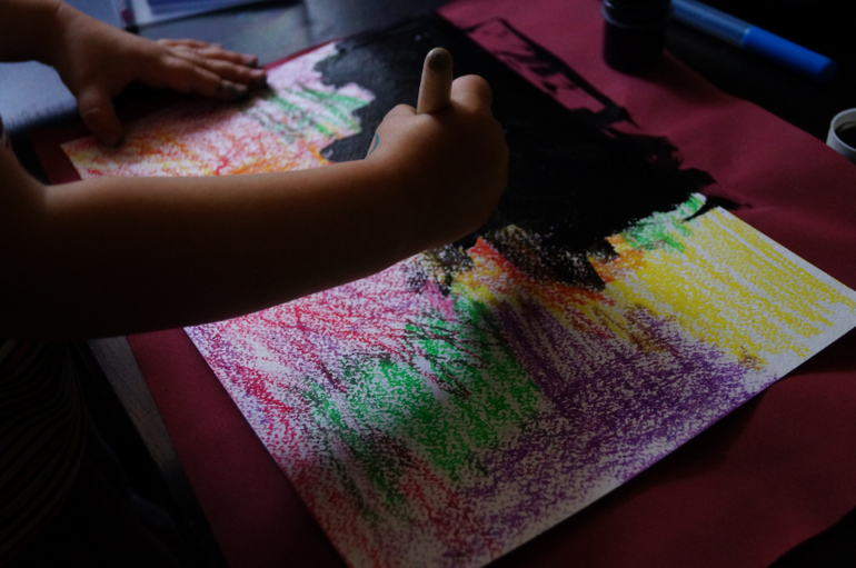 Рисовали мелками каляки на листочке, а потом замазывали гуашью. По высыхании выдраивали рисунки. Поле Очень понравилось!!!