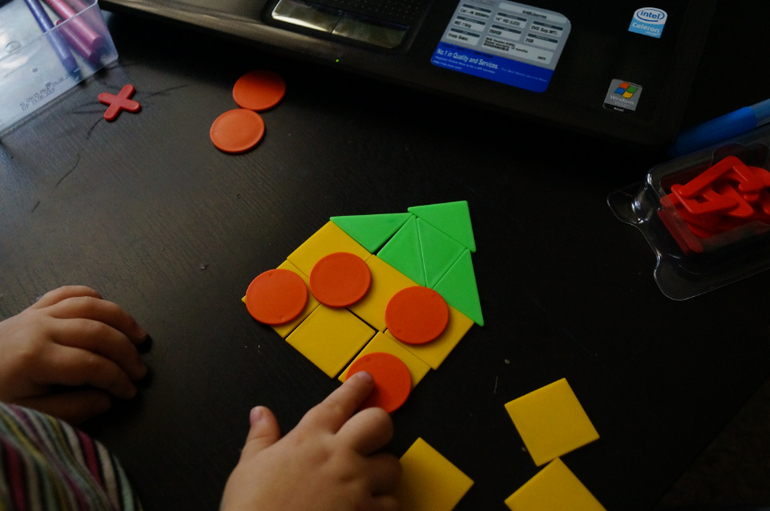 Собираем фигуры из геометрических фигурок. Потом в дом заселяли маленьких животных, и обязательно спрашивали у них пароль! (ответ - Большой папин живот. Угадайте, откуда?)))