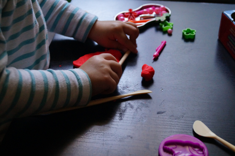 Перед сном решели позанимать съедобной лепкой. Поля выбивала цветочки!)))