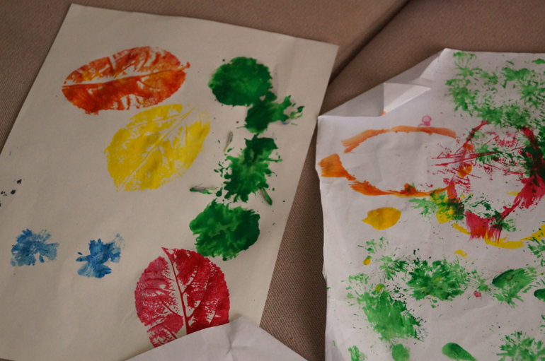 А на днях решила, что Поля уже забыла тот урок с листочками, насобирали новых и делали их отпечатки с помощью красок. Потом отпечатываться в ход пошли цветы, травинки и даже собственные ладошки.))
