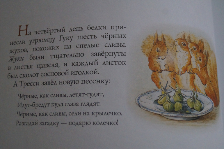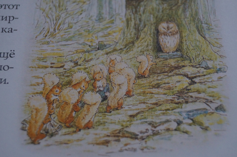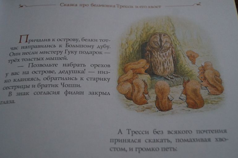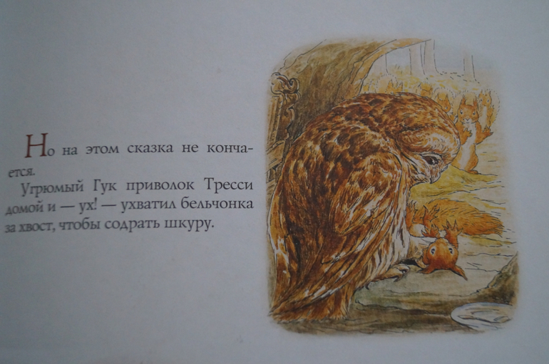 И в конце концов филин схватил бельчонка, который пел песни, потащил к себе в дом, "чтобы содрать с него шкурку", но бельчонок вырвался и сбежал, а в цепких лапах филина остался только пушистый хвост. На картинке видно, как филин схватил белку за шею. Поля тут же меня завалила перепуганными вопросами, в стиле "мама, ему что, оторвали голову???"... Вот даже сейчас я достала книгу и пишу, а дочь опять затянула вопросы про эту голову...