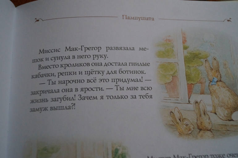 Первый рассказ про кролика Питера, того самого. Если в нескольких словах, то кролик не послушал маму и пошёл в сад к мистеру Мак-Грегору, в котором их папа "был пойман и запечен в пирог" (!!!), этот мистер приметил непослушного и прожорливого кролика, гонялся за ним пол дня, стащил всю кролчью одежду (а это был совершенно новый пиджачок и туфли), которую позже повесил на огродное пугало и потерял часть хвоста.С горем пополам кролику удалось вернуться домой, и позже он занемог (от переедания всякостей с огорода мистера Мак-Грегора), а потом долго ходил в старом пиджаке и старых ботинках и обходилсад злосчастного деда семью дорогами. Ладно, тут вроде бы всё нормально. Кролик не послушал и получил по заслугам. Но вот тема отца уже настораживает, нет?