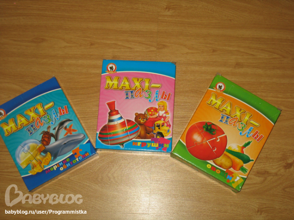 Макси-пазлы. О них я уже писала тут http://www.babyblog.ru/user/Programmistka/3031507, теперь с фото. Буду брать еще, Соне трех коробок не хватает. Собирает по 4 раза в день. Очень хорошие пазлы. Картон очень плотный, картинки красочные и понятные.