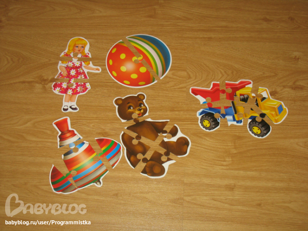 Игрушки. Самый сложный пазл. Машинка - вообще мега-сложная, она у Сони пока вообще не получается, мишка идет со скрипом. Минус тот же, что и овощей - одинаковые пазы.