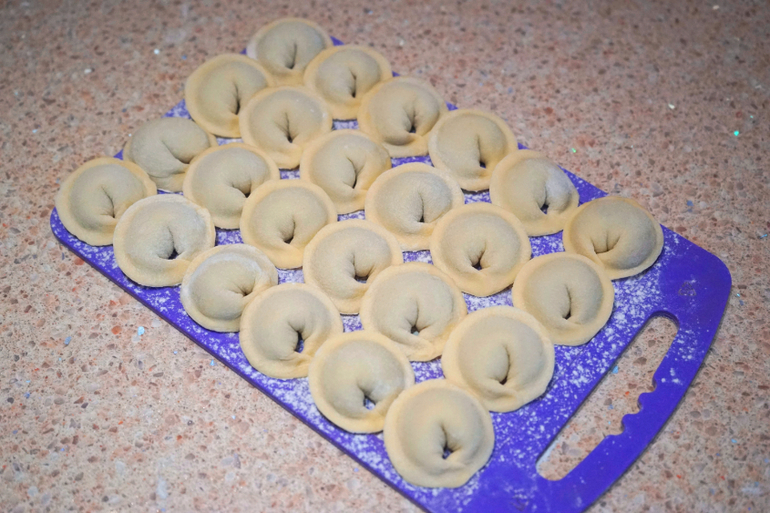 Готовые пельмешки выложить на подпыленную мукой доску, накрыть пищевой пленкой и убрать в морозильную камеру для застывания. Таким же образом поступить со следующей партией. После застывания, пельмешки выложить в мешочки и поместить в морозильную камеру.