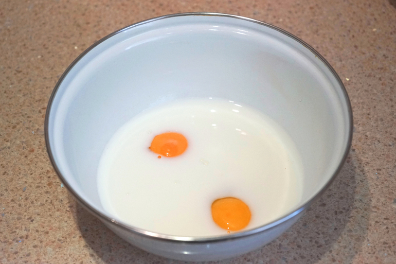 Добавить в миску молоко и воду, вбить два яйца, добавить соль