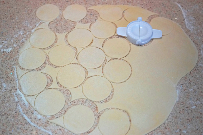 Раскатать тесто в пласт, выемкой вырезать кружочки 4 - 5 см. На середину выложить начинку из фарша. Сформовать пельмешки