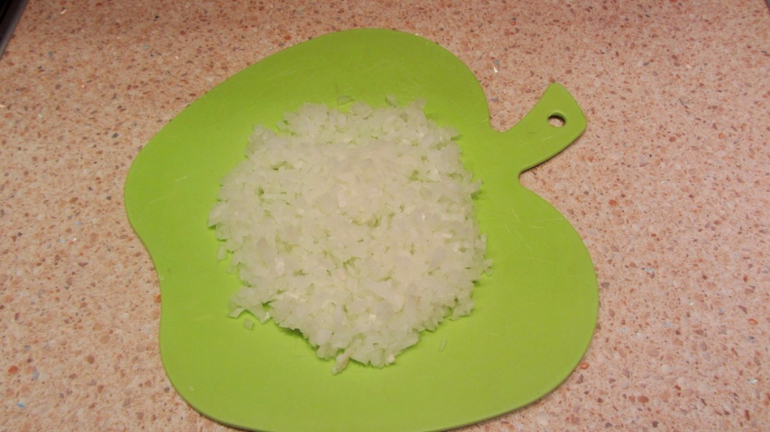 Тесто завернуть в пищевую пленку и убрать в холодильник. Приступаем к приготовлению начинки для пельменей. Лук мелко порезать или измельчить в блендере