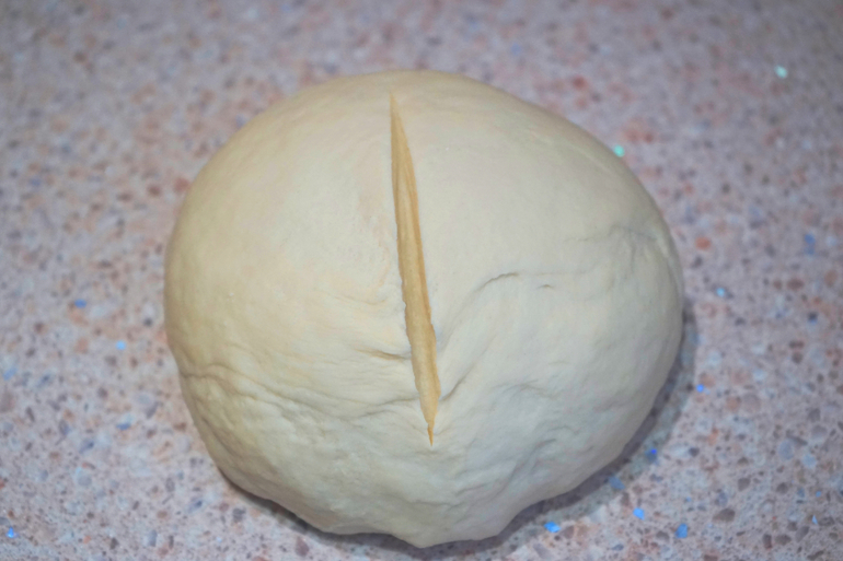Тесто выложить на поверхность стола и добавляя постепенно муку вымешивать в течение 20 - 30 мин до состояния средней плотности. При разрезе край должен быть четко выражен и не растекаться