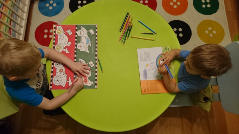 Карандаши. Раскраски самые обычные. Грише постоянно напоминаю:"возьми правильно карандаш", Ваня, естественно, повторят за братом)