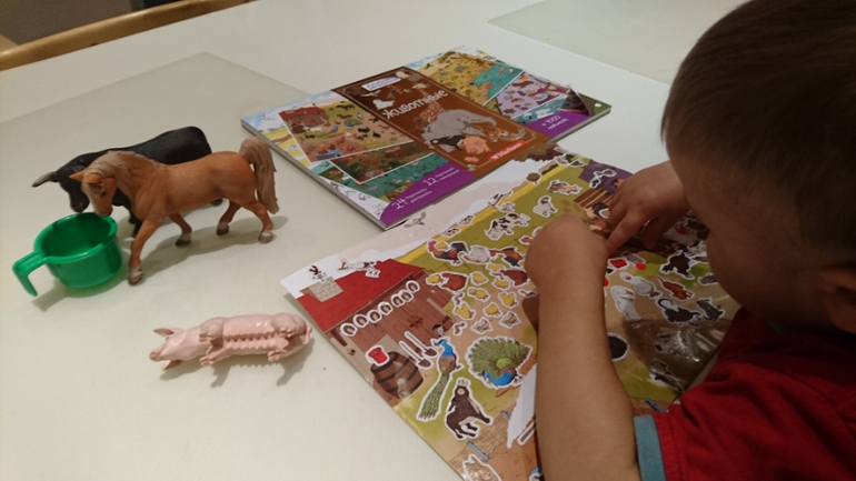 Тематические наклейки. Гриша лепит животных по группам (цыплят к цыплятам, котят к котятам), иногда говорит:" свинку к ослику поближе, пусть пообщаются")))