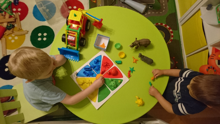Так обоим интересно. В выражениях подражает воспитателям из своего садика)