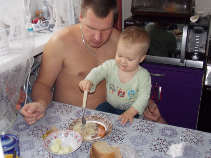 7. Кушать сам не хочет до сих пор (((, даже к ложке не прикасается. Но вилкой иногда может поесть с папой за компанию.