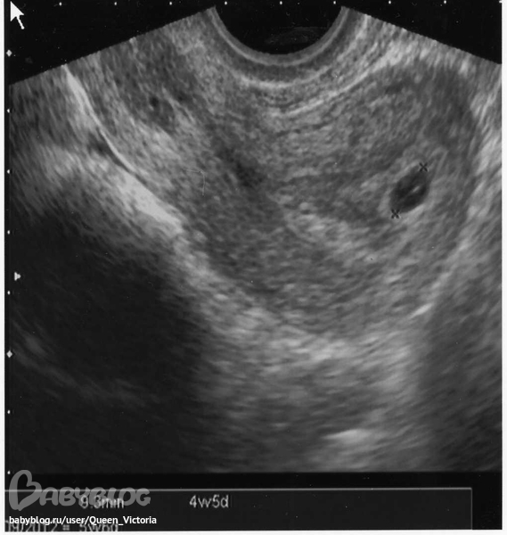 Срок поставили 5 недель 6 дней (акушерских). А плоду 4 недели 5 дней. Над кушеткой, на которой я лежала, прям надо мной был монитор. Так что я всё видела своими глазами :)