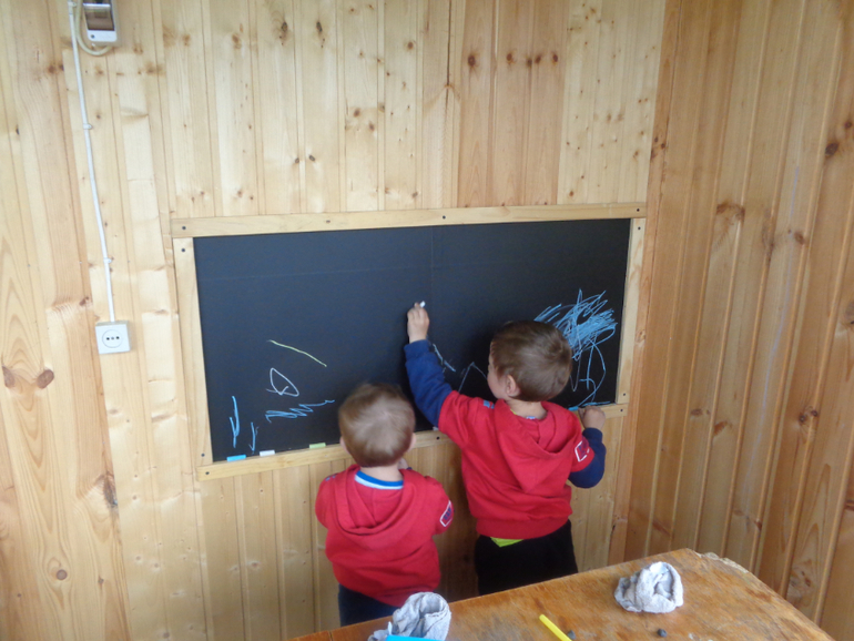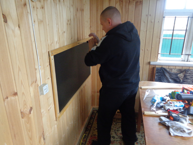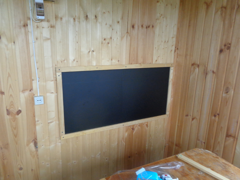 Вот, что у нас получилось из меловых обоев и икеешного мольберта. наконец-то этого дурака вынесли в балкона)