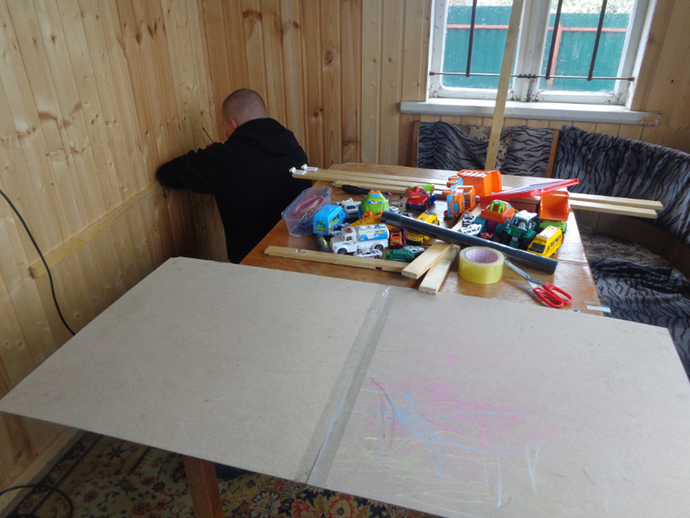 Отворачиваем и выламываем фурнитуру. Прикручиваем длинную палку к стене, не до конца. тем временем я склеила скотчем две фанеры из мольберта.