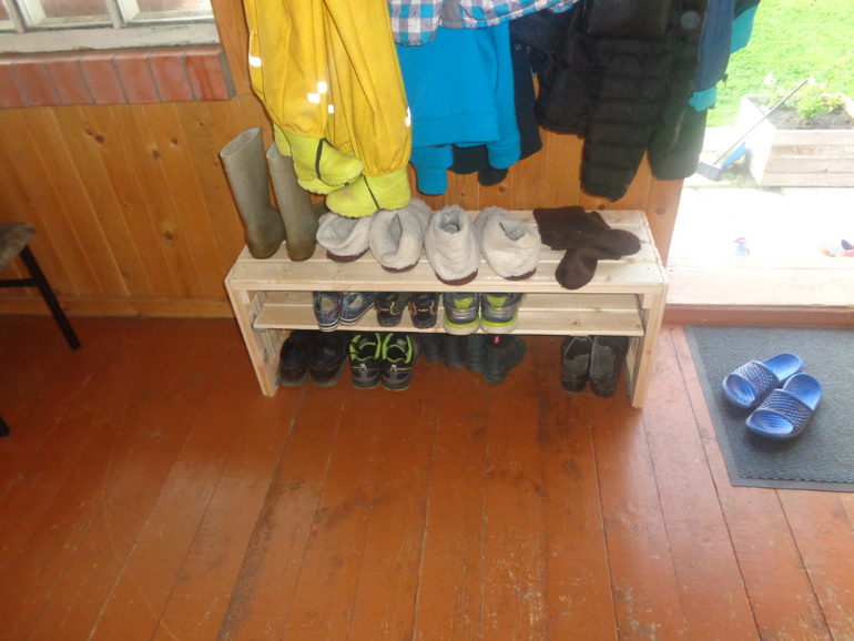 Муж сколотил наконец полку для обуви, на которую влезает весь наш арсенал. Детское даже в два ряда, но это, чую, не надолго. И да.. ленивая мать теперь одевает тим вместе с лемигой сразу)))))