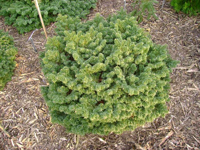 Уже давно хочу - пихту бальзамическую. Какие же у нее шикарные шишки! О полнорослой речи быть не может. Нашлась маленькая Kiwi. Нужен еще один маленький шарик, второй не выбрался совсем. Посадить планирую в между первой линией - коник и линией можжевело-барбарисовой. Там как раз 2 места. Кого еще взять?