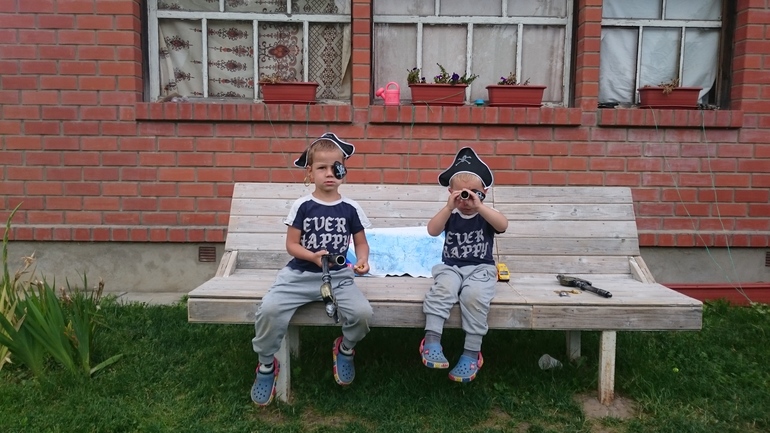 Это старые штаны. Новые пачкать пока не охота. Антига нам уже еще нашила. Темно-синий с серыми манжетами и поясом. Дизайнер я :-))