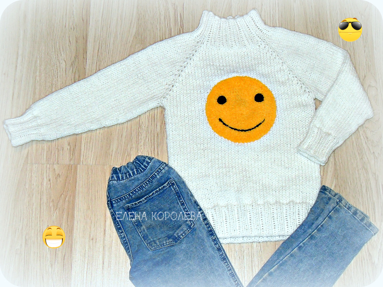 Сначала был просто белый скучный свитер. Потом стала с дочкой думать, что добавить. Цветы, балерину, сердце предлагала.... А она выбрала смайлик)) Сам свитер связан без швов регланом сверху. Пряжа Ланаголд, расход примерно 3 мотка на рост 116 см