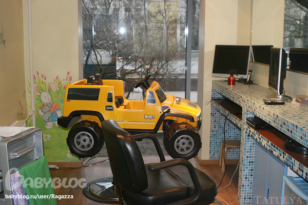 Стрижемся обычно вот в этом хамере. На выбор есть еще одна машина и самолет в соседнем зале. Занимает наша стрижка минут 15.