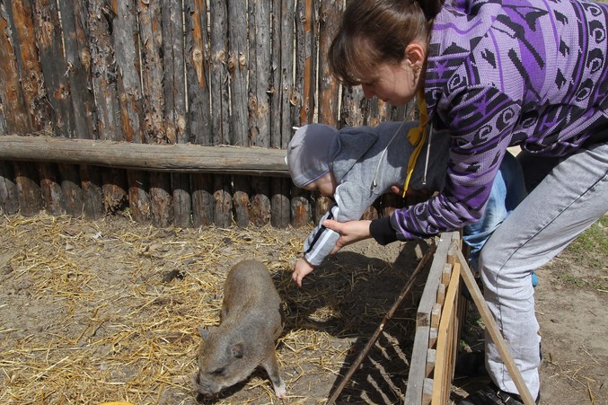Дальше небольшой загончик с двумя минипингами (поросятками маленькими). Ростя все тянулся их погладить, но свинки очень пугливые, постоянно убегали и забавно похрюкивали.