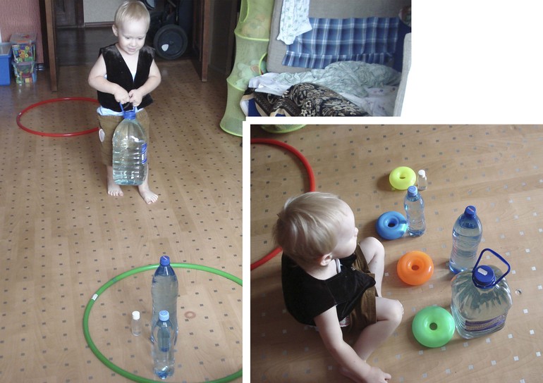 Потом Ростя превратился в муравья (одели коричневые шортики и жилетку, хотела сделать усики, но не вышло...) Узнали что муравьи очень сильные, занялись перетаскиванием бутылок из домика в домик (катег. тяжелое-легкое). Затем расставили бутылки по величине.