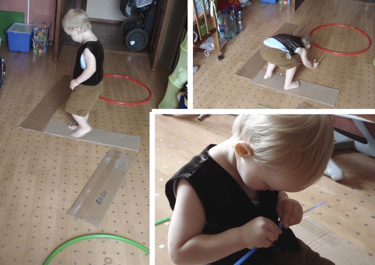 Потом представили что муравей ходит по прутикам и собирает соломинки для домика. Нужно было соломинку вставить одну в другую (катег. узкий-широкий).