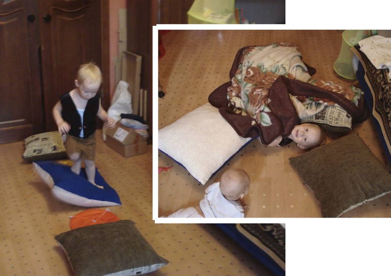 Снова перевоплотился в муравья и стали строить муравейник из подушек и одеяла (подурели), затем муравей прыгал с кочки на кочку)))