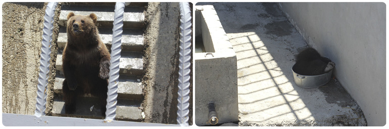 Дальше. У них появились вальеры с медведями. Один большой медведь и медвежонок (пятка из тазика торчит). Морковку обожают, большой медведь, даже в ладоши хлопает - просит. Мишки - это конечно здорово, но вальер у них пока печальный. Очень надеюсь, что они его просто не доделали, тк сейчас это бетонная камера.