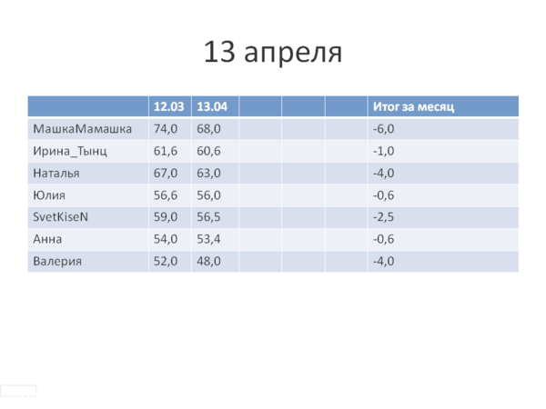 начали мы с вами 12.03, прошел ровно месяц! подведем итоги?