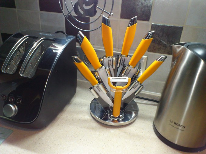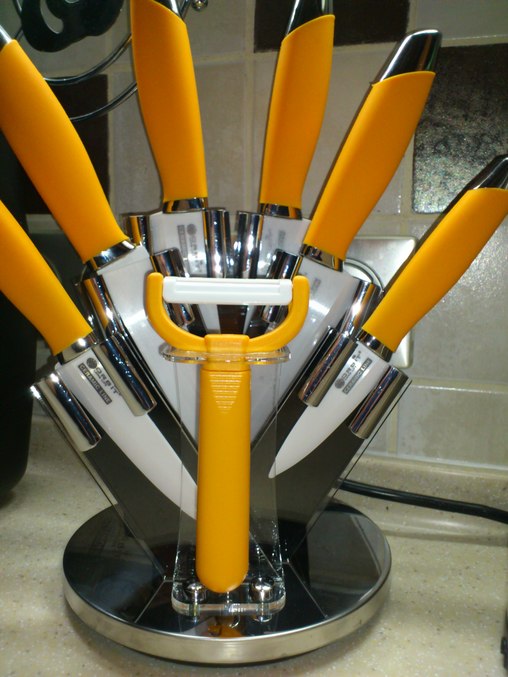 красота! эта подставка крутится на 360 грдусов) а ножички замечательные! керамические, острые) считаю - украшение кухни)