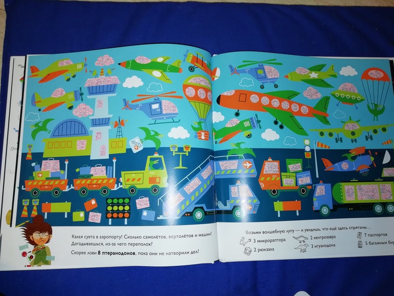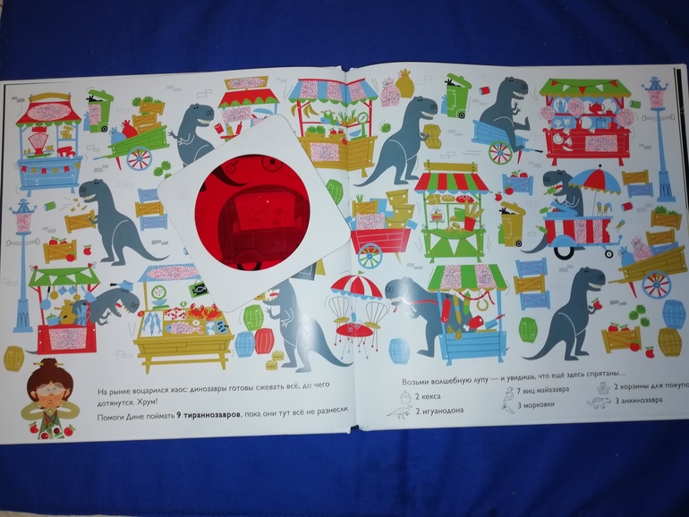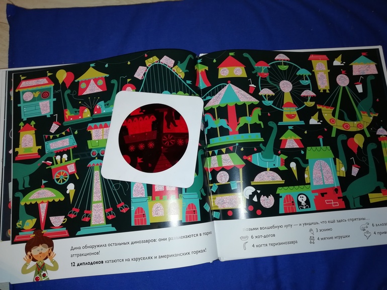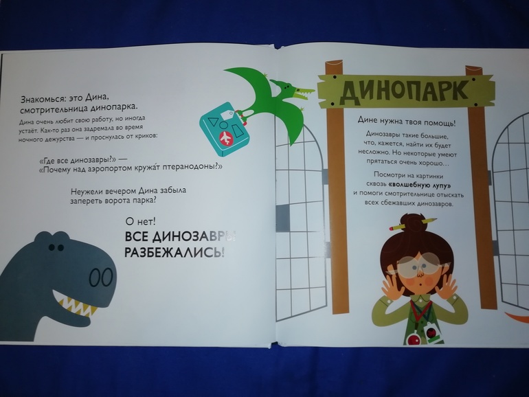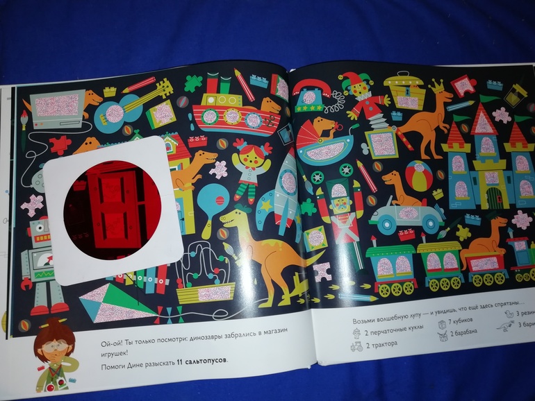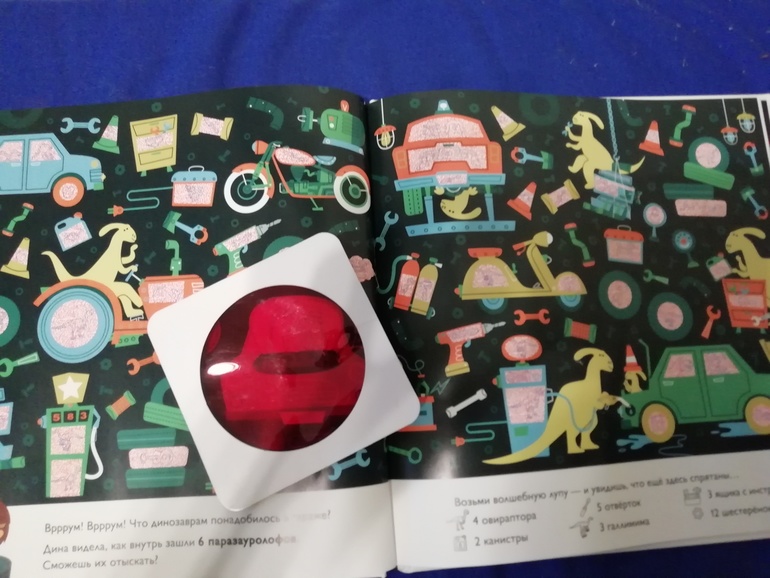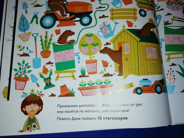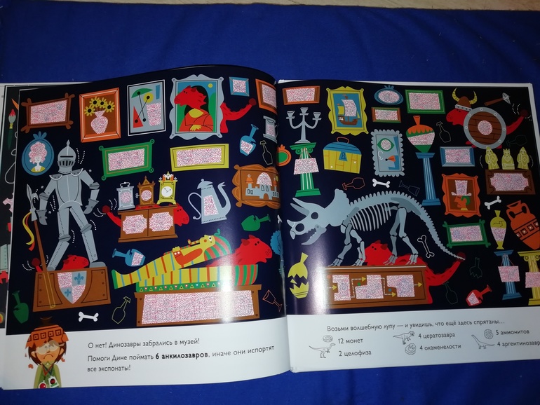 Есть немного текста на каждом развороте и задание найти определенные предметы, например, 4 овираптора, 2 канистры и тп, на каждом развороте свои задания.