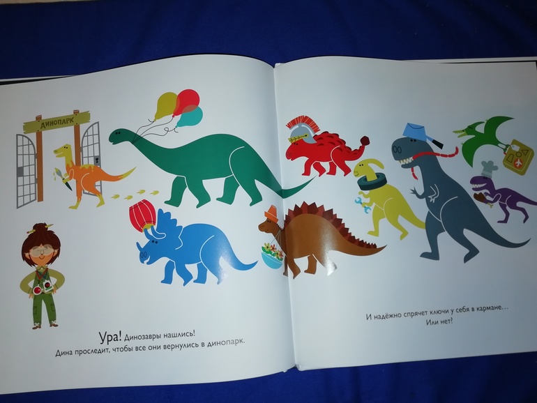 Наша задача помочь Дине загнать динозавров обратно в парк и попутно найти определенные предметы на страницах книги.