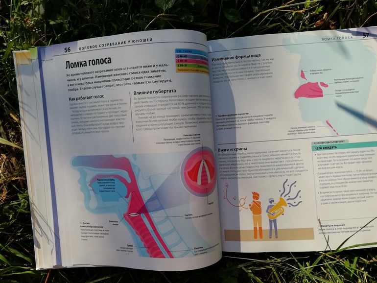 Следующий раздел-половое созревание у юношей. Здесь так же подробно рассмотрены изменения в организме при становлении мальчика мужчиной,есть подробные схемы строения мужских органов и отдельный разворот посвящен ломке голоса. Всего шесть разворотов.