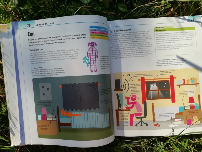 Следующий раздел посвящен здоровому телу. Здесь рассказывается про личную гигиену, волосы и прыщи на теле, здоровое питание, физические упражнения, сон ( а Вы знали, что подростку нужно спать минимум 9 часов в сутки?) и подростковые болезни.
