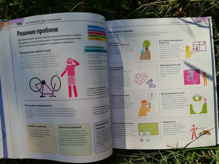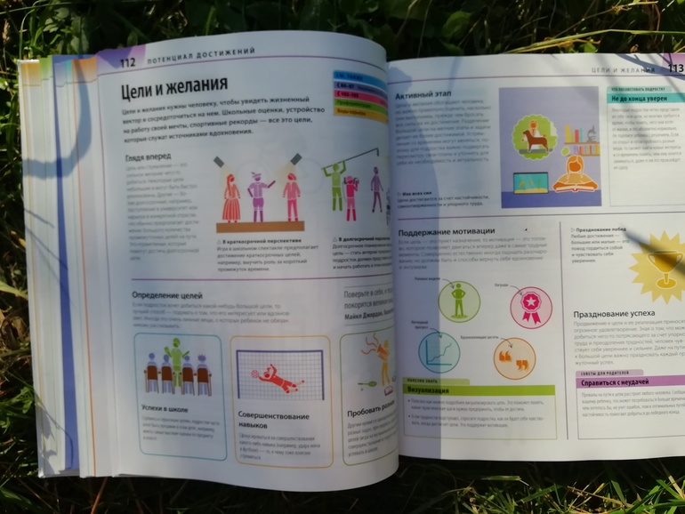 Следующий раздел-потенциал достижений. В нем идет разговор о школьной жизни, экзаменах, решениях проблем, увлечениях, деньгах, целях, карьере, вузе, устройству на работу и публичных выступлениях.