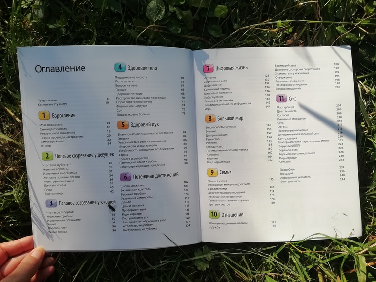 Итак, как мы видим из содержания, книга разделена на 11 разделов: взросление, половое созревание девушек, половое созревание юношей, здоровое тело, здоровый дух, потенциал достижений, цифровая жизнь, большой мир, семьи, отношения, секс. Про последний раздел я напишу очень подробно в конце поста.