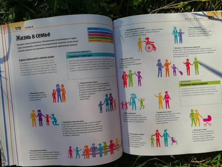 Следующий раздел-семьи. В нем обсуждаются виды семей, в том числе приемные семьи (но что очень важно для меня, здесь нет однополых семей, огромное спасибо за это автору книги Роберту Уинстону, а то книга иностранная и я очень волновалась, что где-нибудь да и проскользнет тема однополых отношений, так как во многих странах она считается нормой. Я не считаю такие отношения нормальными и книгам, где это пропагандируется не место в моем доме. Вот такая я вот нетолерантная), отношения с родителями, разрешение конфликтов, трудные жизненные обстоятельства, братья и сестры.