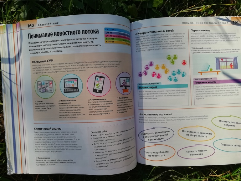 Следующий раздел-большой мир. В нем освящены вопросы взаимодействия подростка с окружающим миром, такие как безопасность, травля, дискриминация, равенство, религия, гражданство, новости, алкоголь, курение и наркотики.