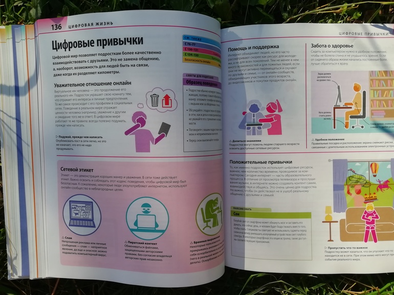 Следующий раздел-цифровая жизнь. В нем рассказывается о интернете, соцсетях, безопасное поведение в интернете, цифровые привычки, кибербуллинг, конфиденциальность и игры. На мой взгляд, в наше время, это очень важная тема для обсуждения с подростком, ведь он должен понимать, что в интернете люди могут не являться тем за кого они себя выдают.