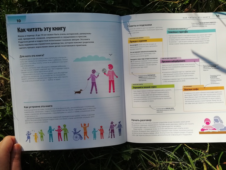 В книге есть подсказки для родителей, интересные факты, разрушители мифов, что посоветовать подростку, полезная информация и осторожно. Эта информация выделена отдельными цветными рамочками, что очень удобно при чтении. Сама книга проиллюстрирована диаграммами и схематичными изображениями подростков и взрослых, так же есть подробные схемы строения тела.