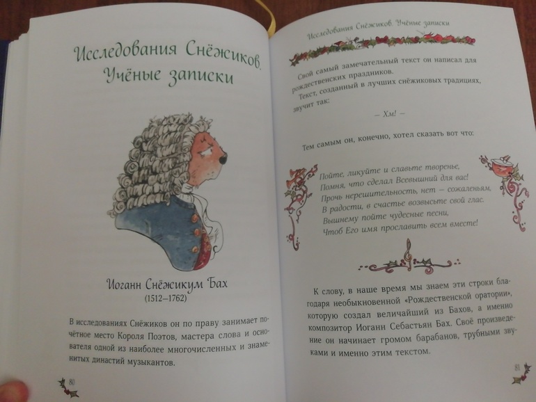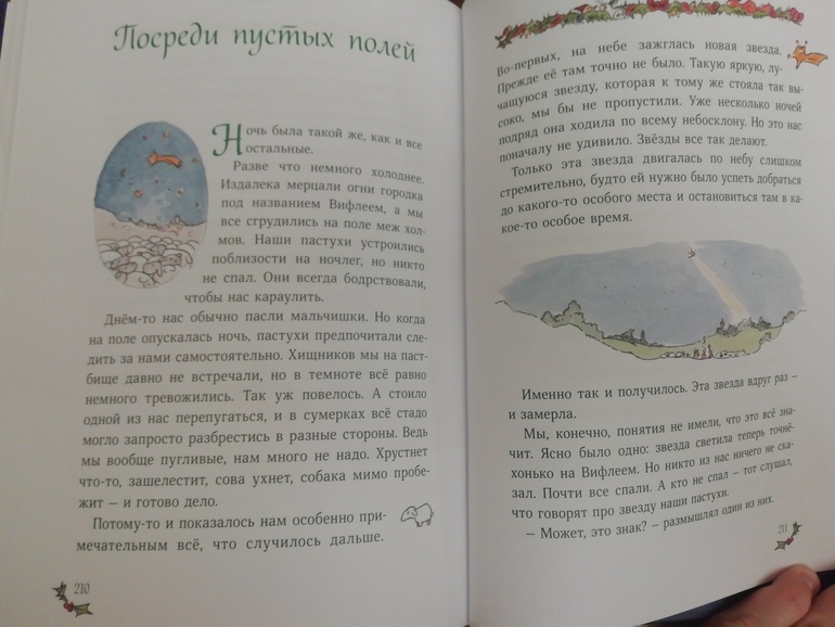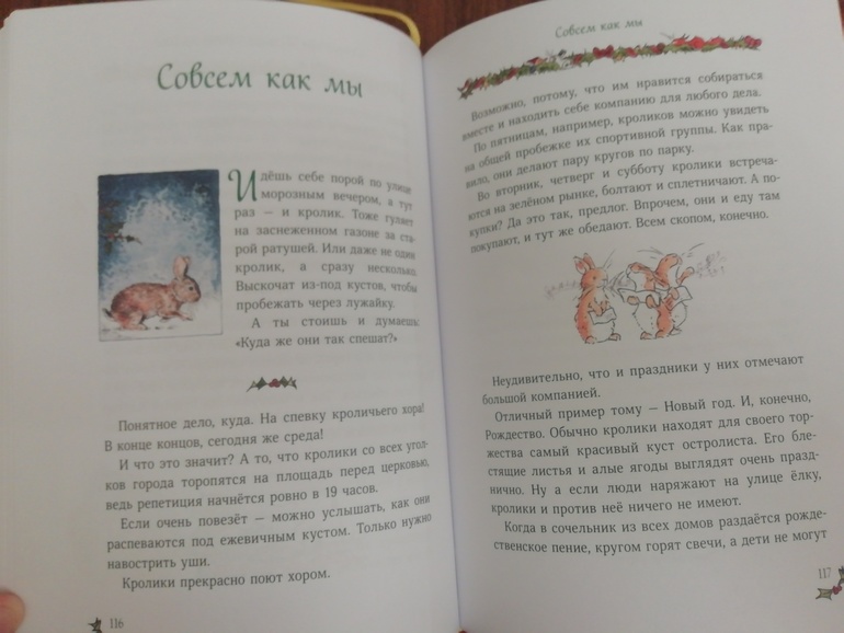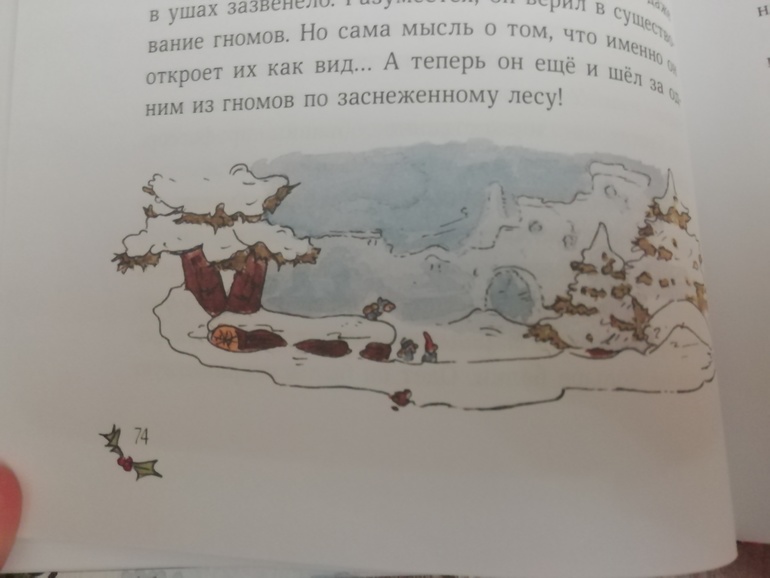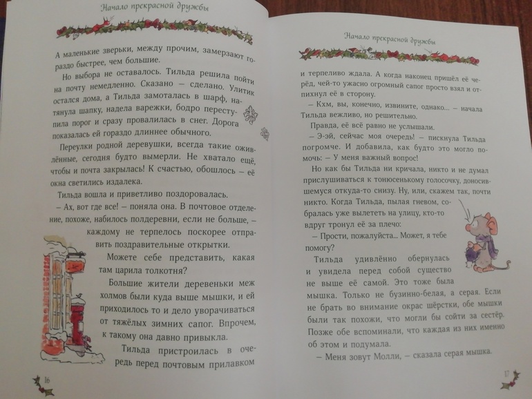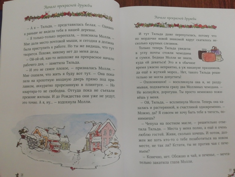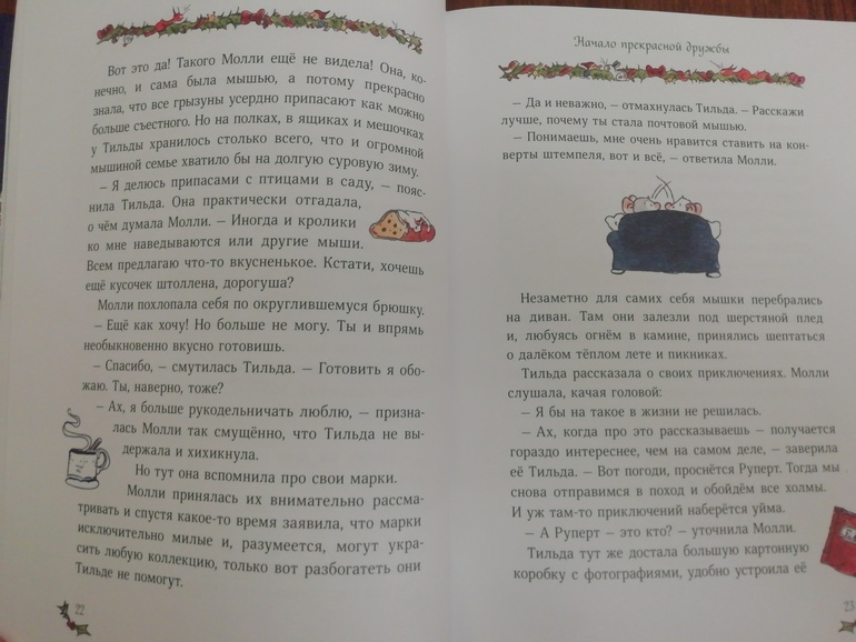 Только вот мы с дочкой читали эту книгу в кроватке перед сном, предварительно приняв горизонтальное положение и положив голову на подушку, накрывшись теплым одеялком. Мы любим читать такие книги перед сном. Текст очень уютный и убаюкивающий. Дочка с радостью засыпала под эту книгу. Истории разные, объединяет их ощущение праздника и зимы, доброта и взаимовыручка, дружба и понимание. В некоторых историях мы встречаем волшебных существ, например приведение собачки, гномы на Крайнем Севере и, конечно же, Санта-Клаус.