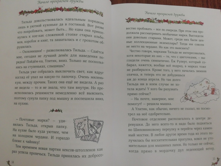 Очаровательные иллюстрации в книге, которые никого не оставят равнодушным. На мой взгляд, они очень уютные и спокойные. Такие иллюстрации прекрасно дополняют текст. По размеру они не очень большие и занимают не много места на развороте. Но они очень очаровательные, дочка любит их рассматривать. Книгу мы читали перед сном, но при переворачивании каждой странички, дочка просила показать рисунки в книге.