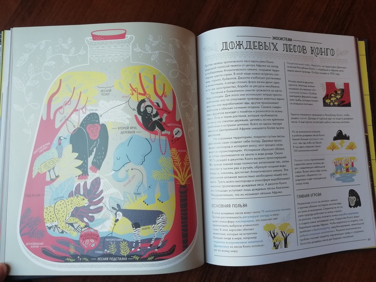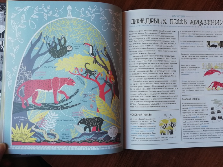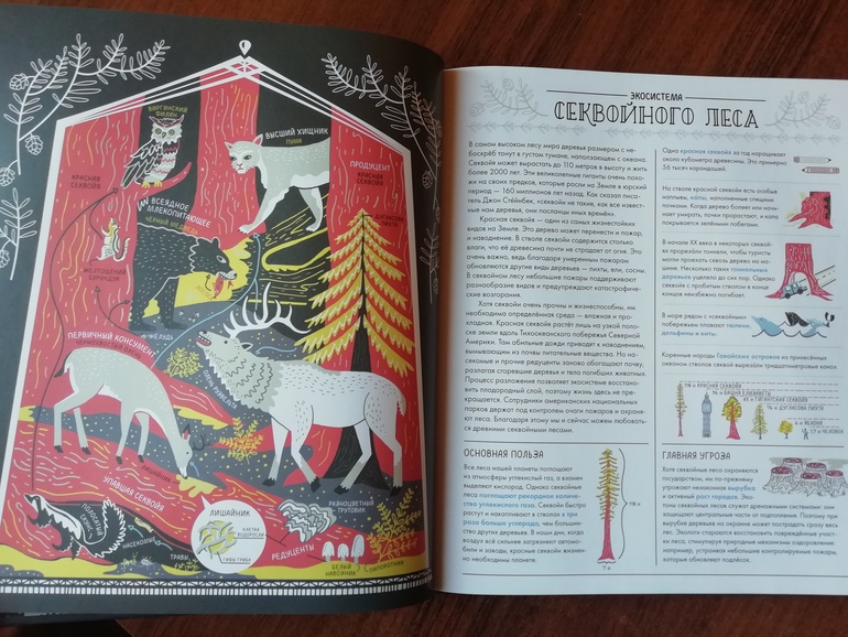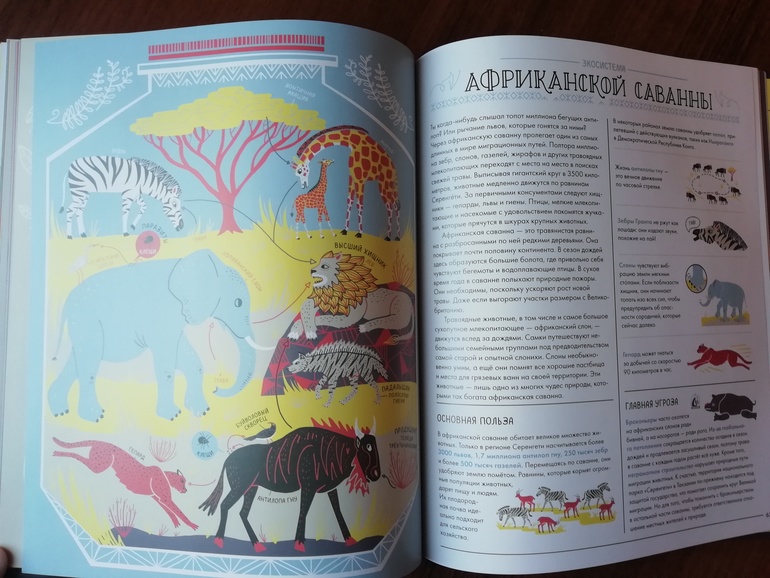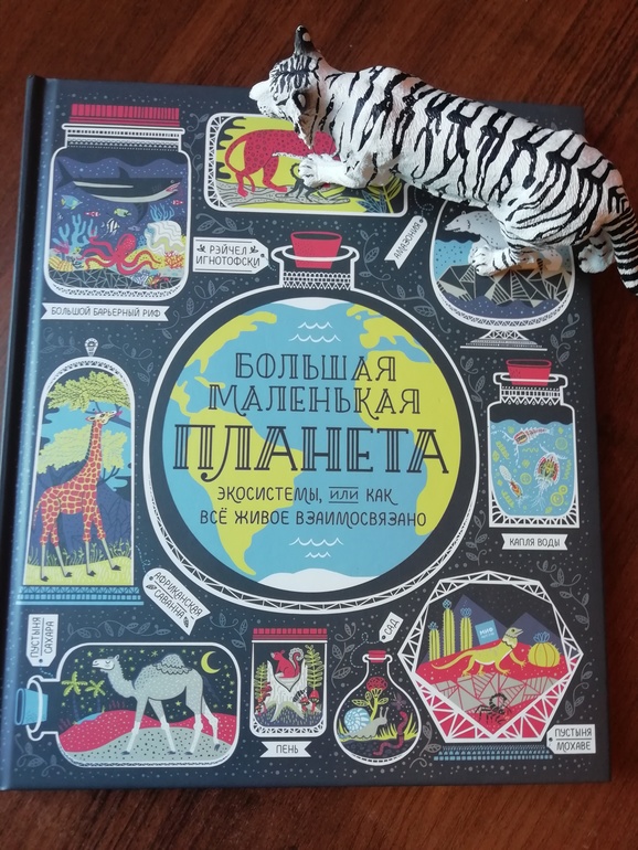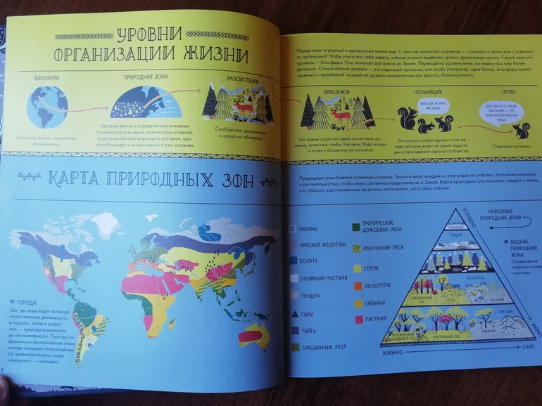 Первый раз мы в книге прочитали про организацию уровней жизни. Было интересно и познавательно. На этом же развороте мы изучили карту природных зон, предположили где могут обитать кошки. Дальше разговор пошел об экосистемах. Конечно, само понятие экосистемы было Ксюше незнакомо и я ее с ним познакомила. Мы поговорили о том, как живые организмы взаимодействуют друг с другом, поговорили о важности каждого организма и его ценности для экосистемы.